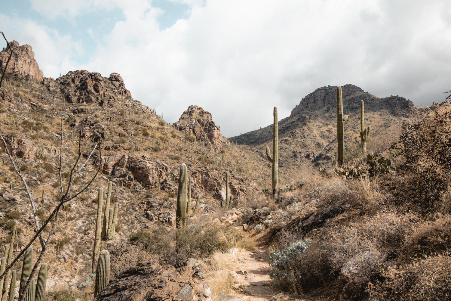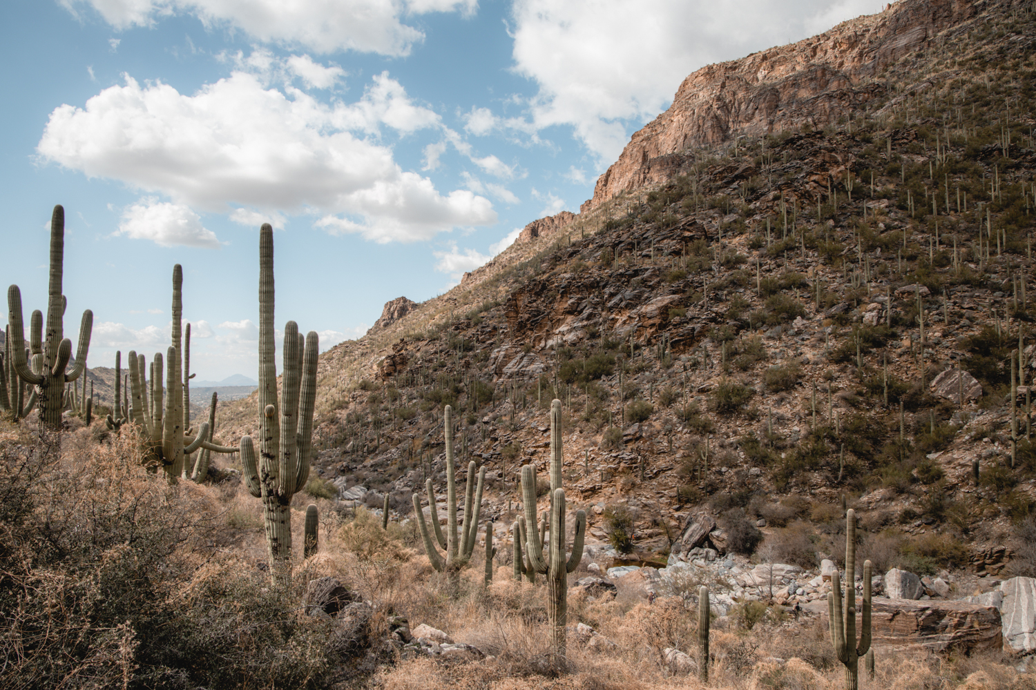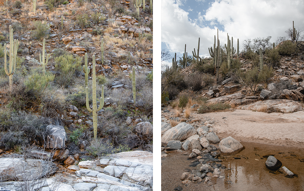 As always when exploring in the desert, it’s important to carry enough water for yourself and everyone in your party. Generally, you want 17 oz. of water for every hour you’re on a trail. You’ll find large ½ gallon green Stanley thermoses in the JTH Tucson pantry to borrow for your trek. Add some ice and fill them with water before heading out into the desert. We also recommend you lather up in sunscreen and pack your favorite sunhat. You’ll cross back and forth over water on this hike and at higher water times it can get very slippery, so bring water shoes. If you plan to swim at the base of the falls don’t forget your suit and towel!