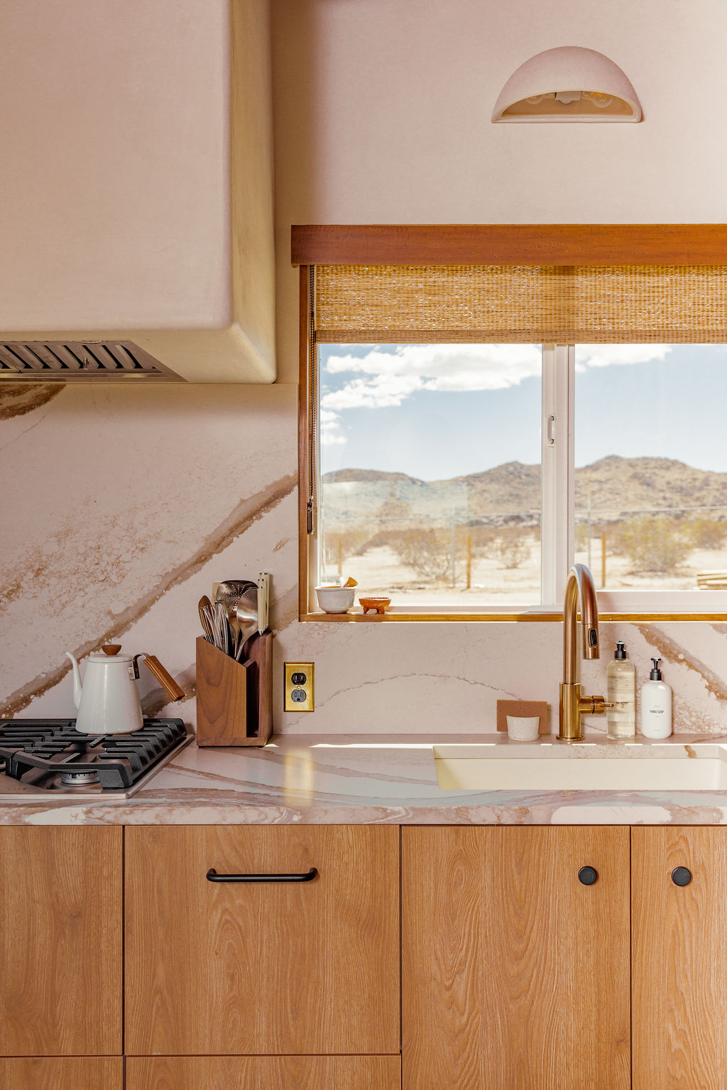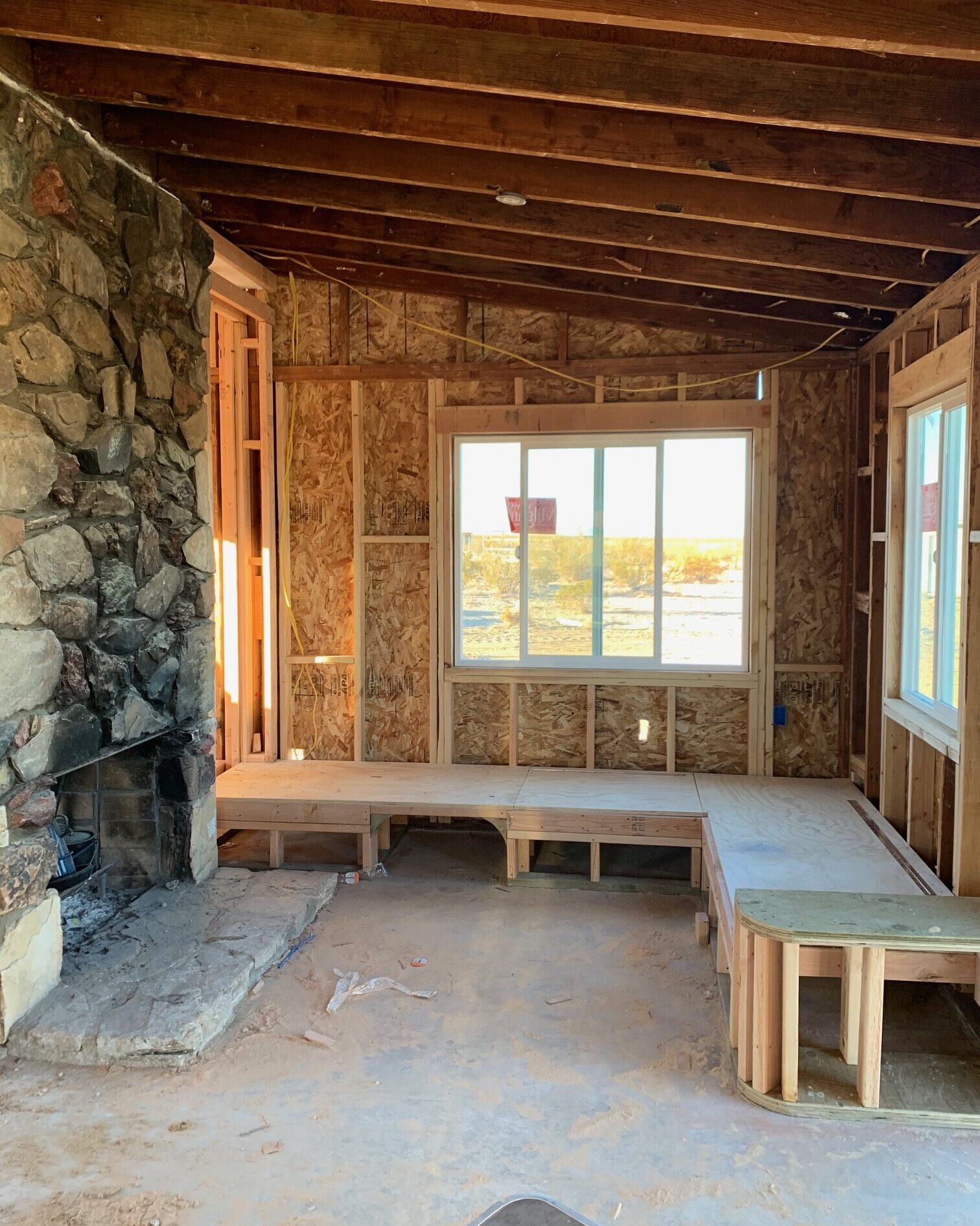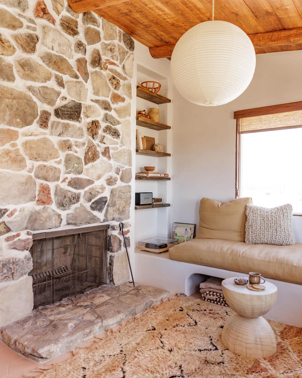 The cabin had been renovated in the 1980’s and 90’s and was missing most of its original components aside from the stone fireplace when we purchased it. We chose to turn that fireplace into the focal point of the space to honor some of Joshua Tree’s homestead history while adding modern day amenities (ie we added a bathroom vs the original outhouse, electricity, heating and cooling etc).