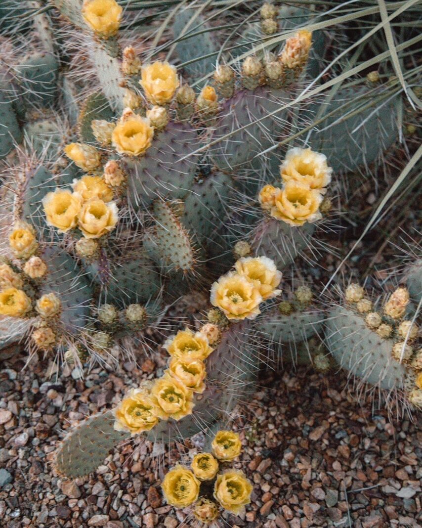 Prickly Pear Cactus (also known as Opuntia or Nopal), are a common type of cactus to find in both Tucson and Joshua Tree. Recognizable by their paddle shapes, these cacti produce lots of brilliant yellow blooms throughout the Spring and early Summer. Each bud only blooms for a day, but each plant has lots of buds so the bloom season stretches; sometimes for months. One of our favorite things to observe about Prickly Pears is that throughout the course of the day, their blooms fade from yellow to the most perfect pale peach color. Once the blooms wither, the fruit (or tuna) ripens in the late summer. We are already getting excited about Prickly Pear margaritas to come (and Prickly Pear lemonade, and Prickly Pear syrup, and Prickly Pear wine, etc. etc.)