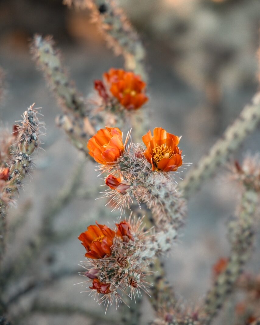 Starting in March you’re likely to spot some cacti blooming at lower elevations in both Joshua Tree and Tucson. By April Prickly Pears will start flowering. May is the prime of the season for Prickly Pear cactus blooms, and you’ll also find Cholla blooming along with many other species that time of year.