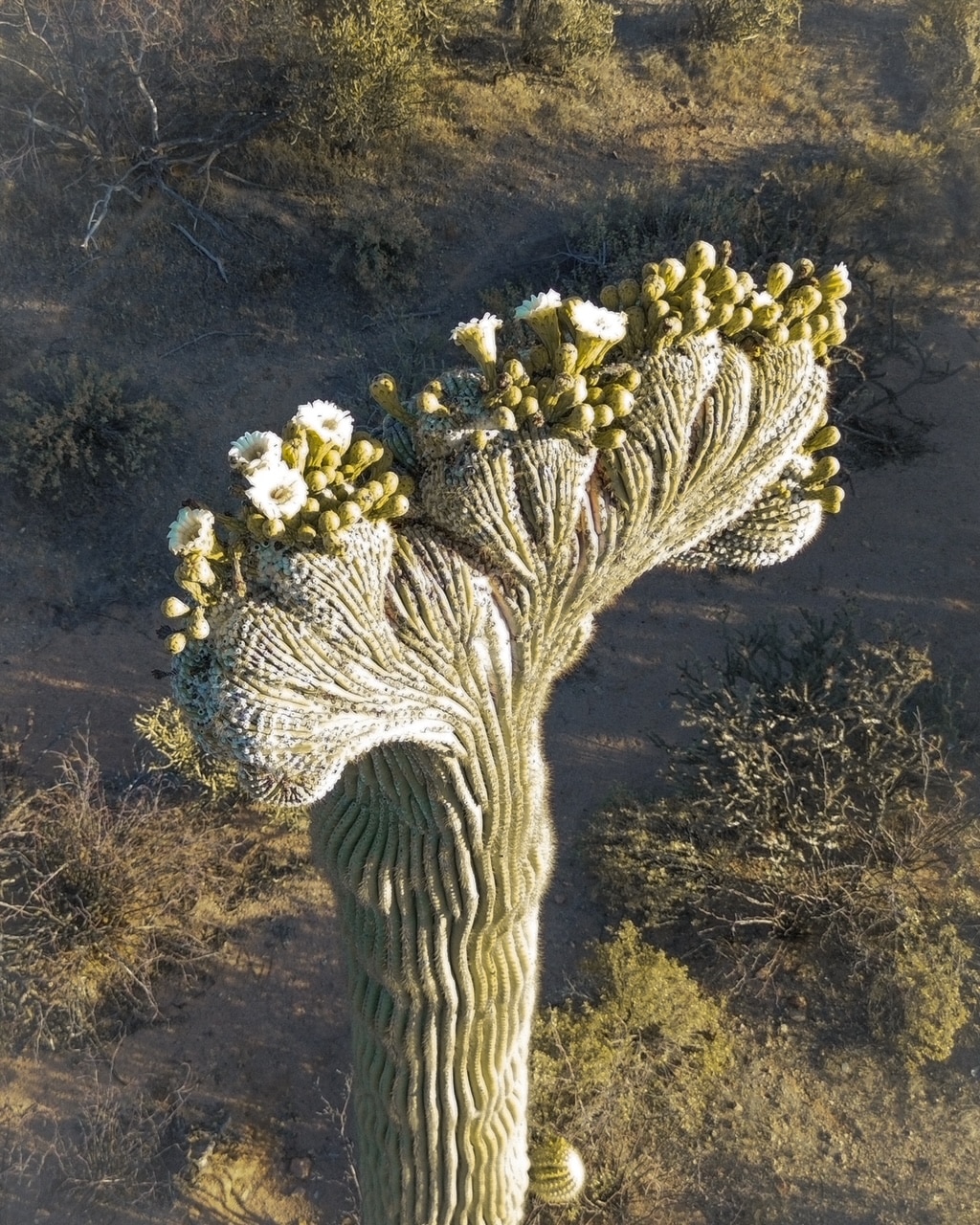 We have recently discovered a couple of rare crested or cristate Saguaros on and near our grounds. We used a drone to capture this one in bloom!