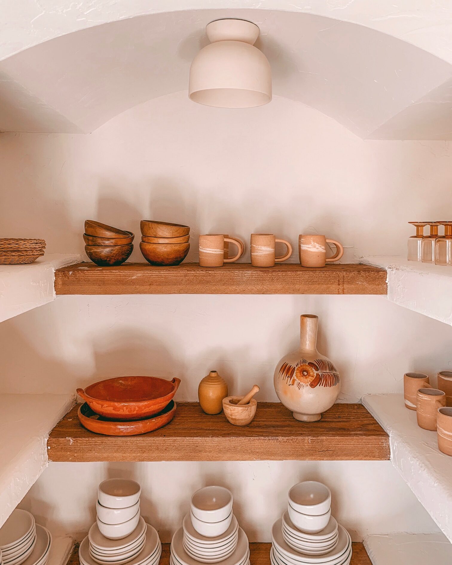 Also on display in pantry is matte white dishware by HF Coors, a local ceramics company. (Our wine glasses we grabbed on a daytrip to Mexico, the town of Nogales is only a couple of hours from us! Most of the other pieces pictured are vintage finds.)