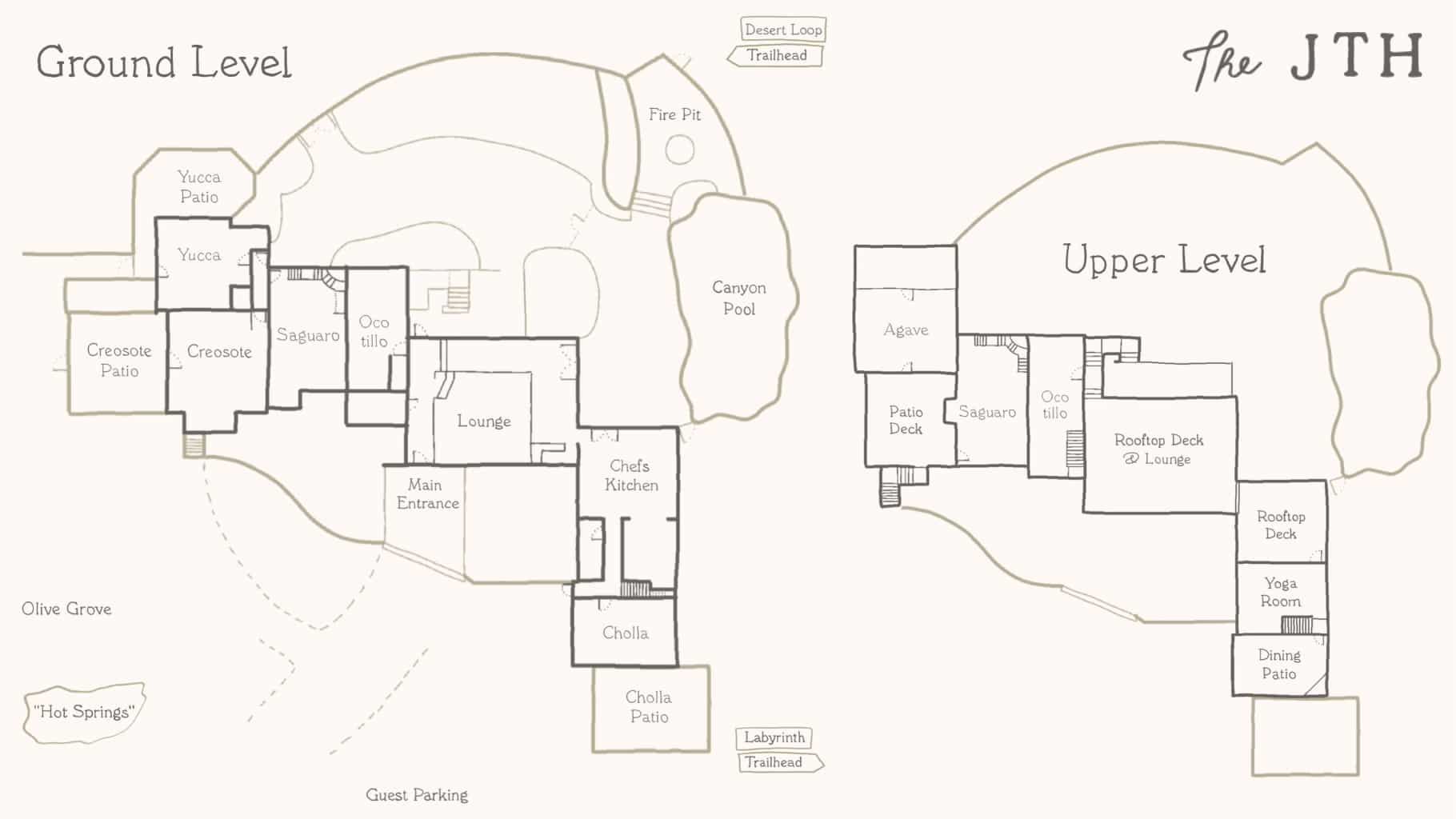 There’s a total of six suites and seven beds (one suite has two bedrooms) here at the inn, as well as ample shared common areas for group gathering. Our buyout guests have private access to the entire inn and its grounds, including the hot springs style hot-tub, canyon style pool, fire-pit lounge, rooftop dining patio, yoga room, chef’s kitchen, living room with a projector and BYOB bar, and 40 acres of trails to explore. Please read more about the on-site amenities here.