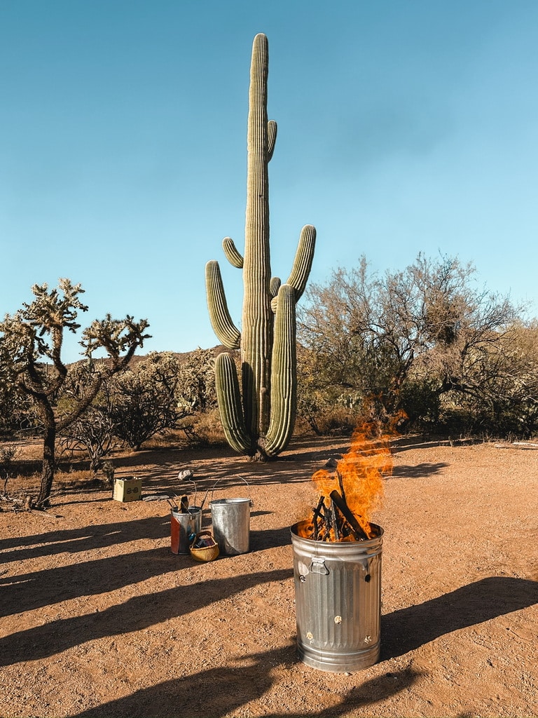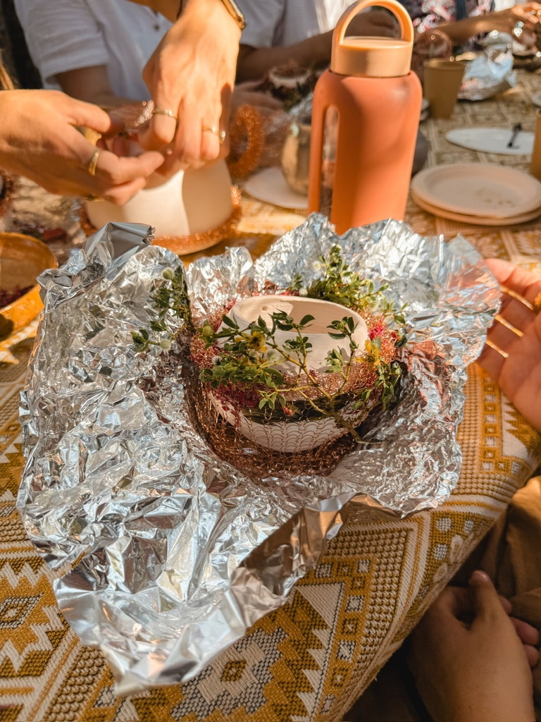 After learning about her process, we got to choose copper & botanicals to wrap around our pots. We used a mix of dried botanicals that Shazieh brought along, and plants we foraged from around the grounds. After the pots were lovingly decorated, we wrote affirmations on slips of birch bark and slipped them inside. Then we wrapped them in tin foil and placed them into the can to be fired.