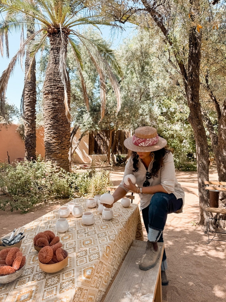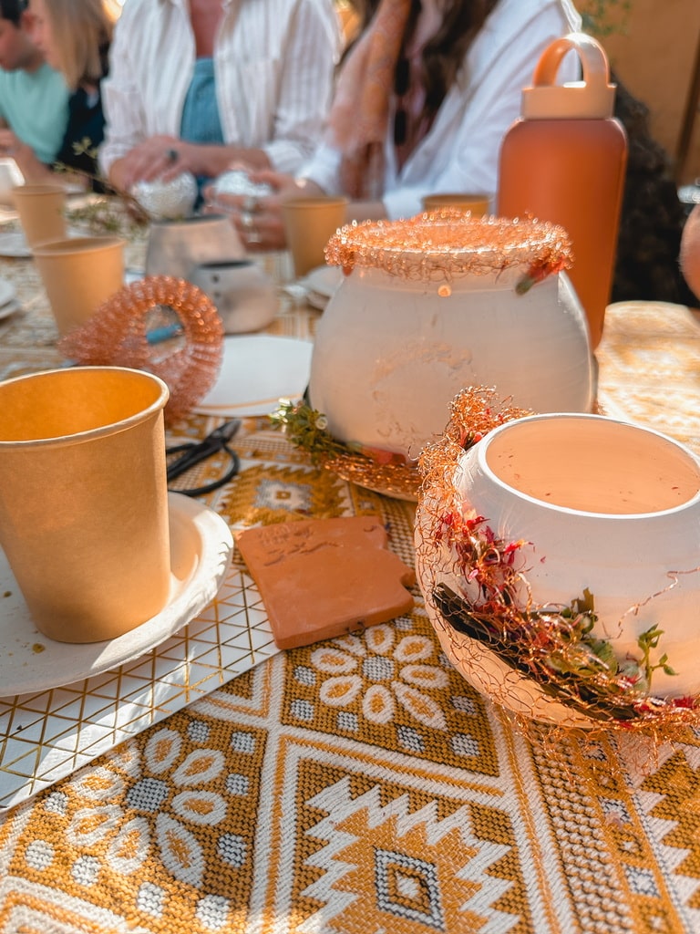 Our afternoon started by enjoying some of Shazieh’s specialty Persian love cake with tea in our olive grove surrounded by the smell of blooming jasmine. After snacks it was time to get to work. Shazieh had thrown, stamped with cholla branches, and bisque fired her signature spirit pots for each participant prior to the event, so they were all ready for us to decorate and fire.