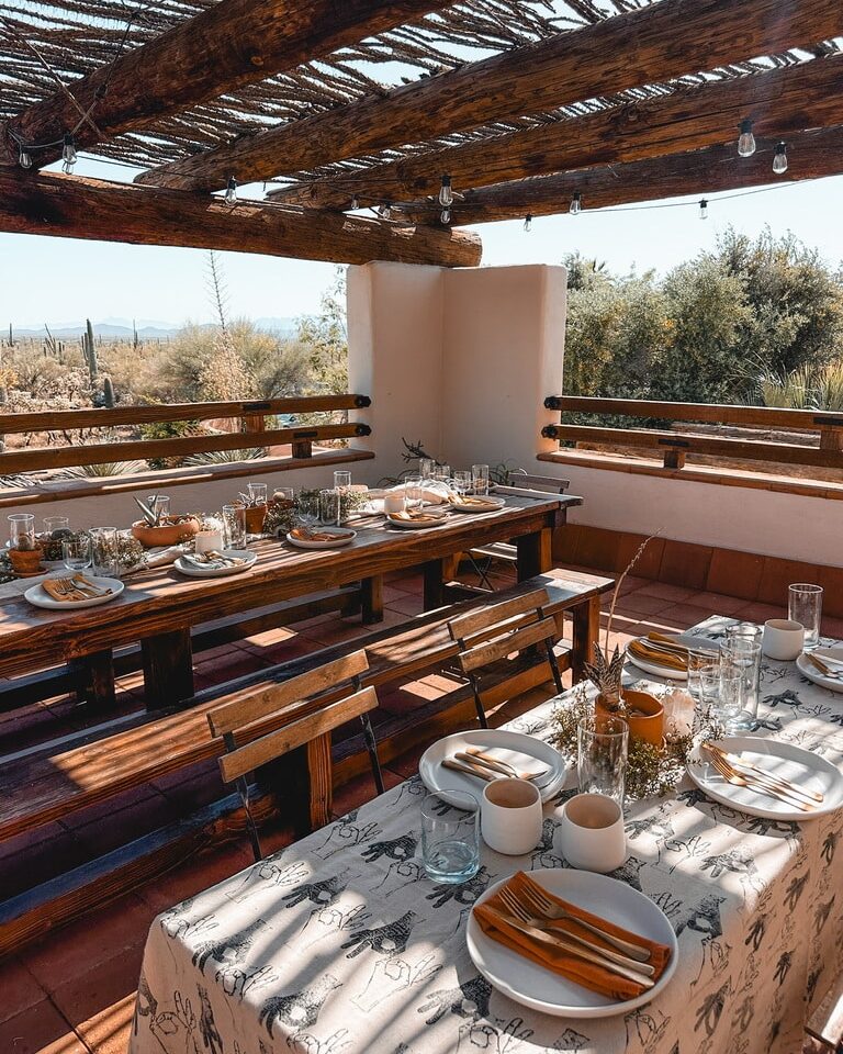 While we waited, we kept our minds and bellies occupied with a beautiful Southwestern family-style meal on the rooftop prepared by Private Chef Mike. With our dessert, we sampled our house-made prickly pear wine and Mertails, a non-alcoholic cocktail made with juniper foraged in Joshua Tree. After dinner, we headed out onto the rooftop for a sound bath under the stars with Jess. During the sound bath mother nature treated to us to a show—we could hear a pack of coyotes howling out in the desert, while overhead a rare atmospheric aurora displayed.