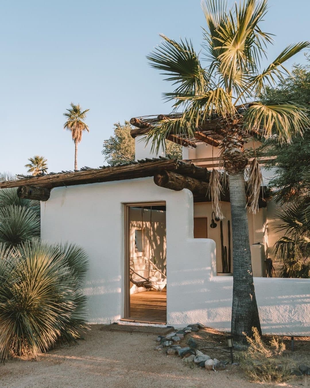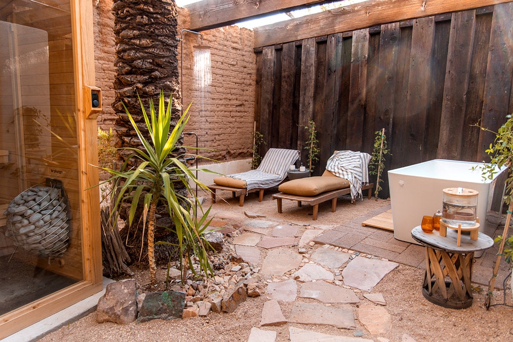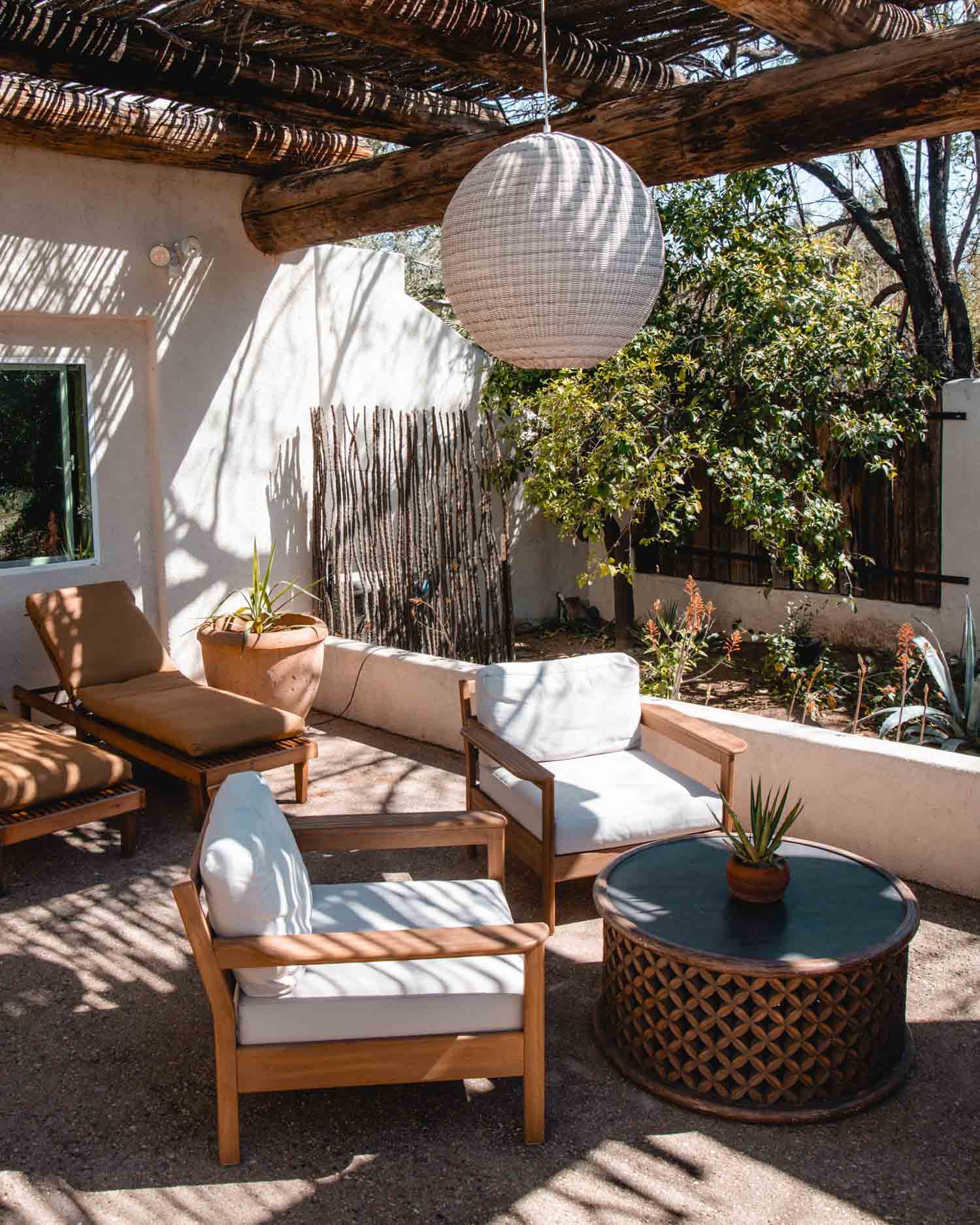 Creosote Suite is incredibly spacious both inside and in its private patio. It has an ensuite bathroom and a dining table inside and outside with cozy areas for gathering.