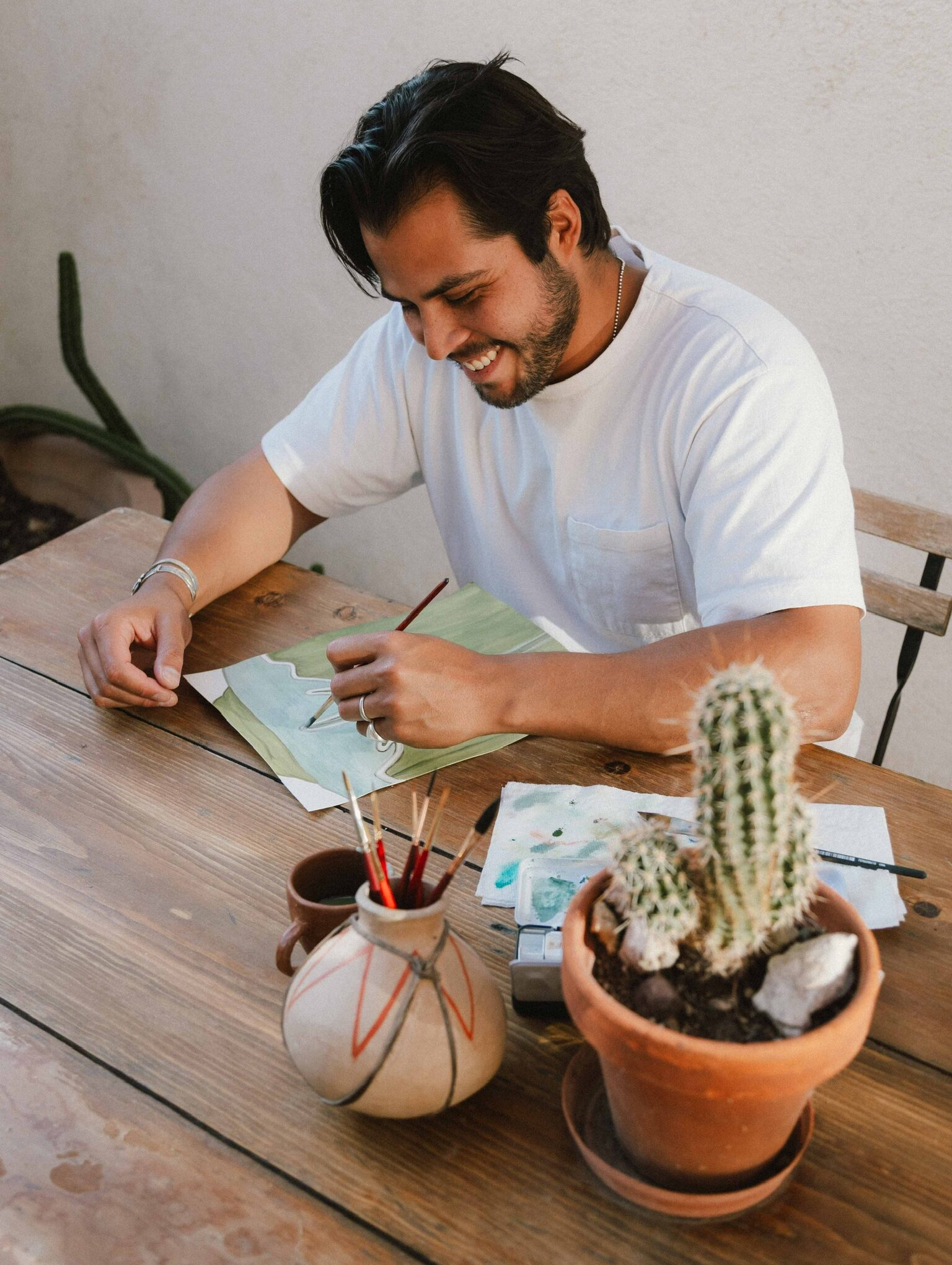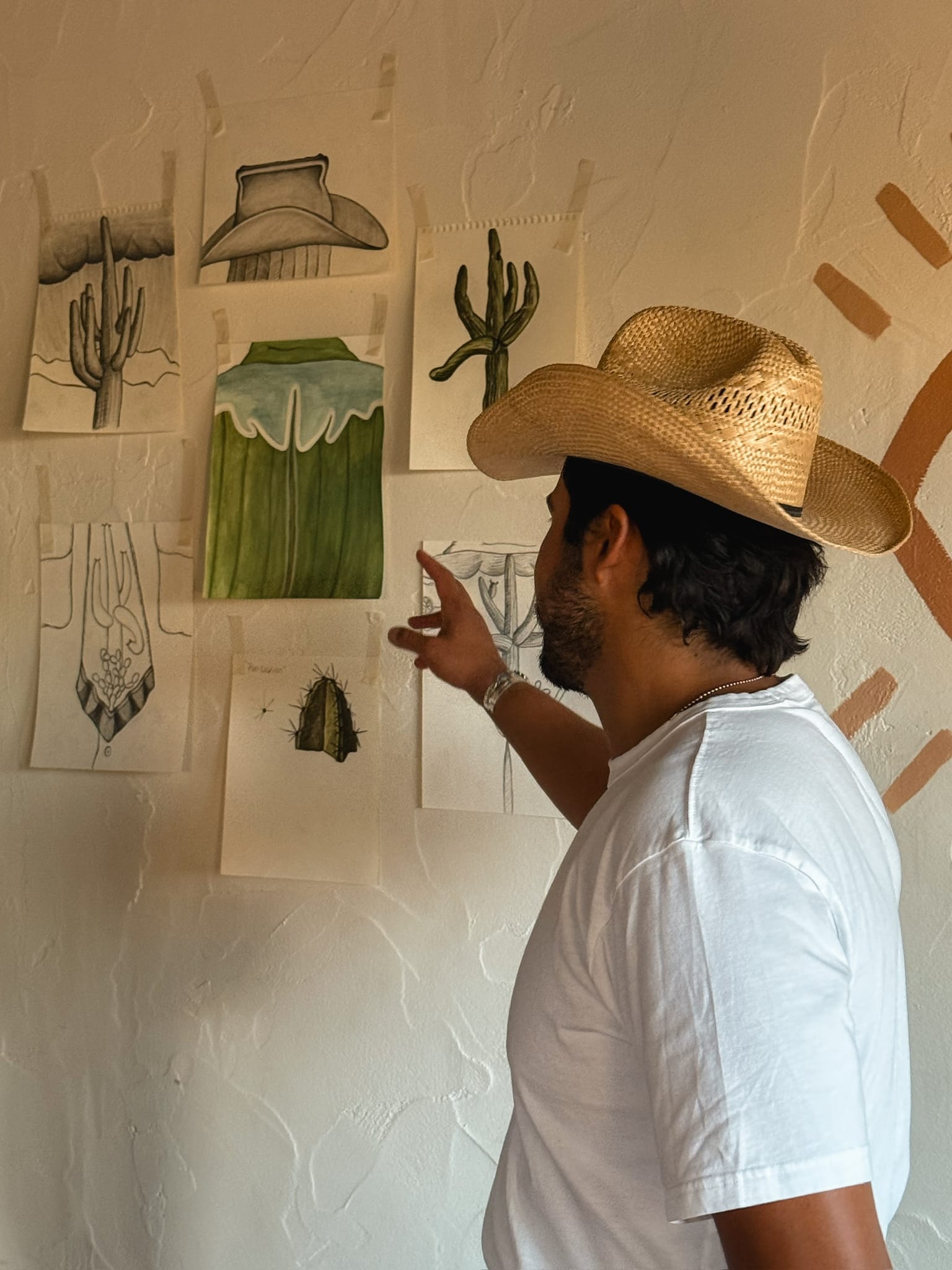 Daniel Falcon is a contemporary visual artist and currently creates works on paper that juxtapose cultural elements. He spent time with watercolors on the private patio of our Creosote Suite. His print work is available at his Casa Studio!