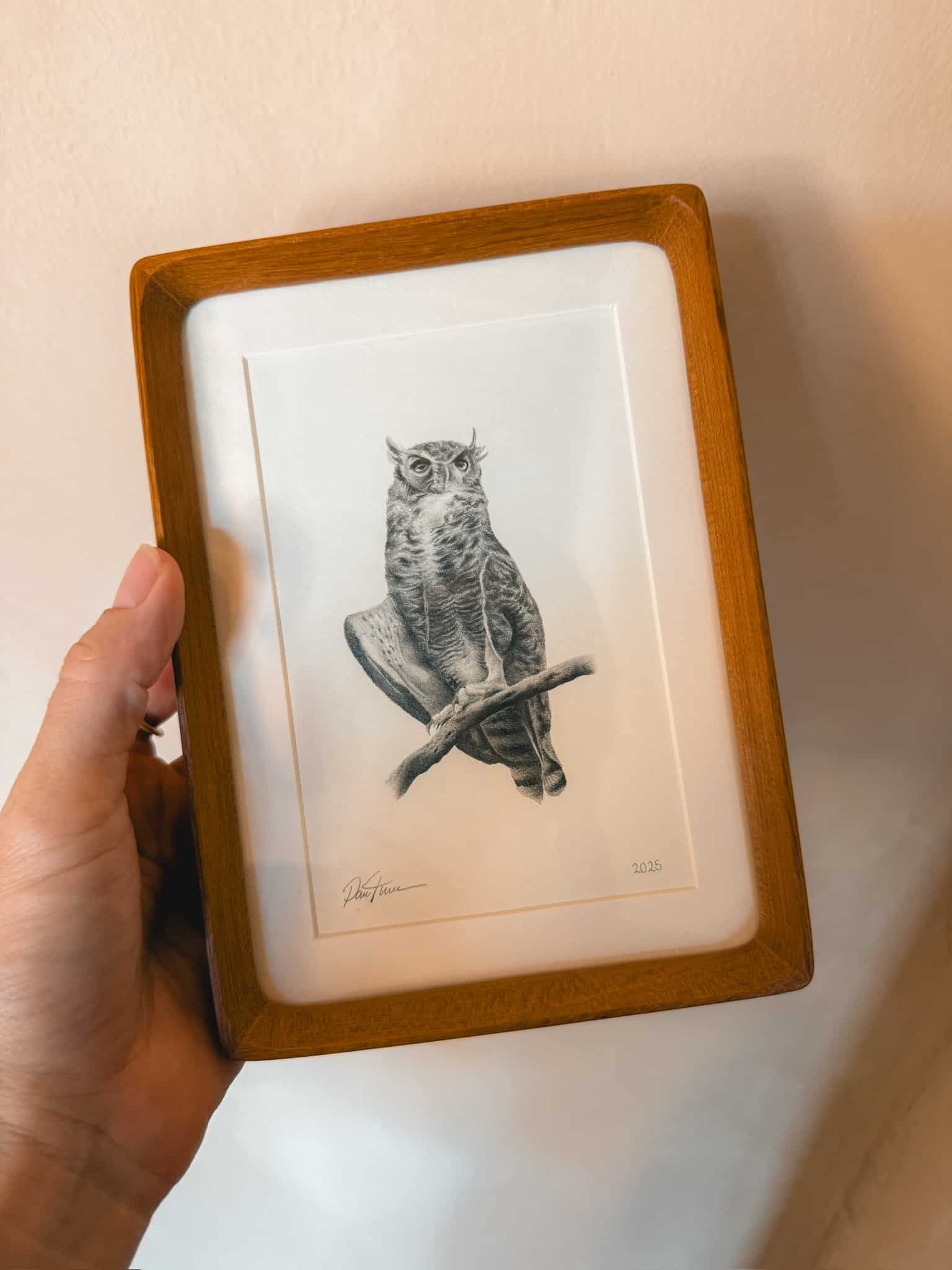 A beautiful piece that we are now grateful to have in our collection is this stunning portrait of the great-horned owl who resides in the palm trees here at the inn, drawn with graphite pencil by Parker Thornton.We’ve all grown especially fond of the owl (whom we realize needs a name!) throughout the years and it was our delight that Parker felt an immediate connection meeting the owl too. Parker shared a lovely recollection of his experience being part of the artist residency: A Full Circle Journey: My Magical Experience At The JTH Artist Residency.